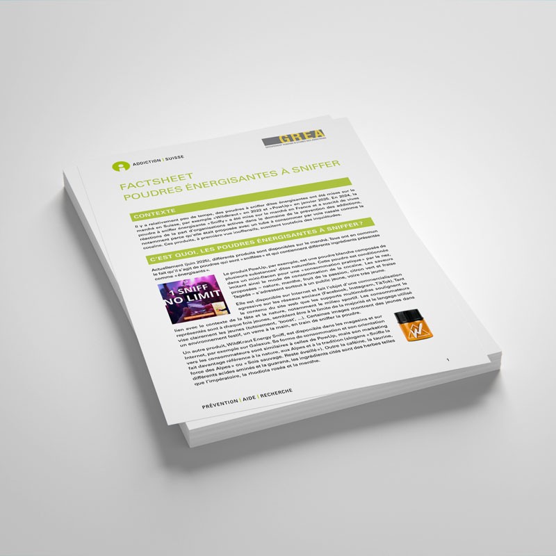Il y a relativement peu de temps, des poudres à sniffer dites énergisantes ont été mises sur le marché en Suisse, par exemple « Wildkraut » en 2022 et « PowUp » en janvier 2025. En 2024, la poudre à sniffer énergisante « Sniffy » a été mise sur le marché en France et a suscité de vives réactions de la part d’organisations actives dans le domaine de la prévention des addictions, notamment parce qu’elle était proposée avec un tube à consommer par voie nasale comme la cocaïne. Ces produits, à première vue inoffensifs, suscitent toutefois des inquiétudes.